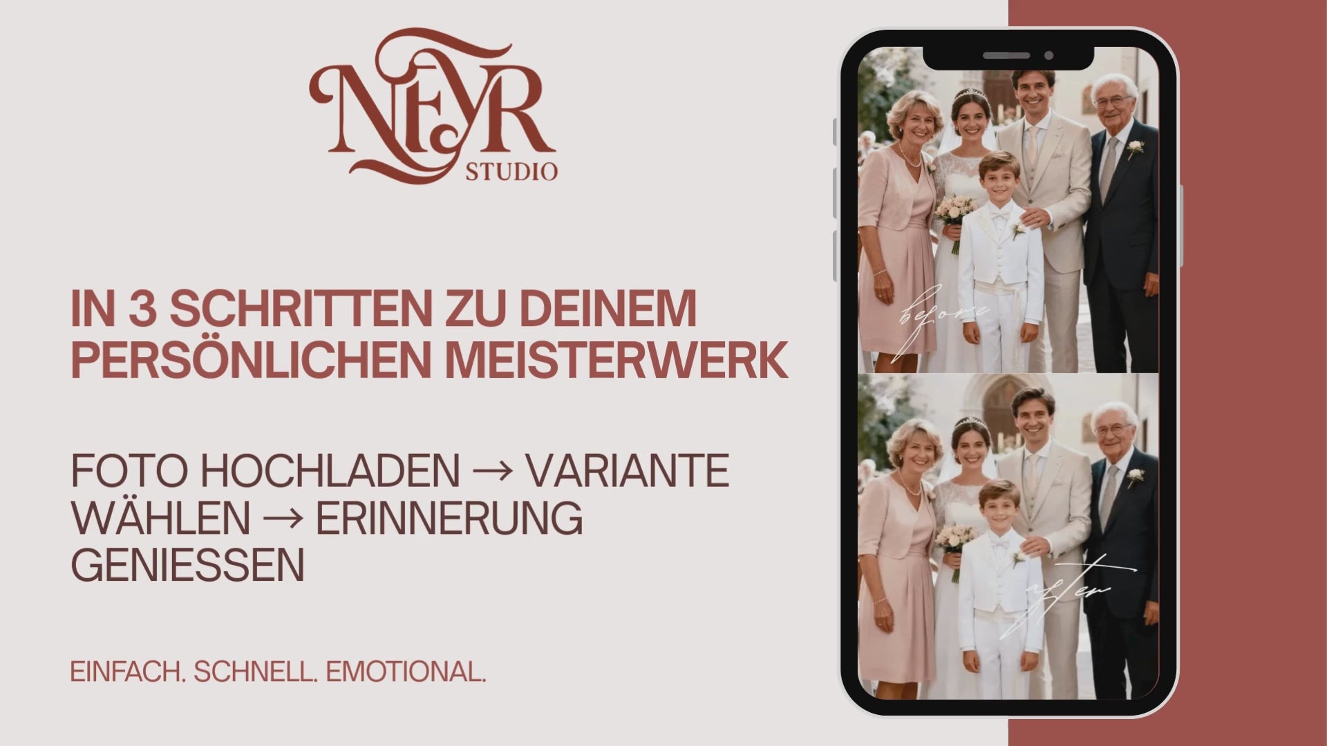 Jedes Jahr verblassen 30% der analogen Fotos unwiederbringlich. Kratzer werden tiefer. Farben verschwinden. Gesichter werden unkenntlich. Das Foto deiner Großmutter aus den 1950ern. Das Hochzeitsbild deiner Eltern. Das erste Familienfoto mit dir als Baby. Diese Momente existieren nur EINMAL. Aber es gibt einen Weg, sie zu retten.